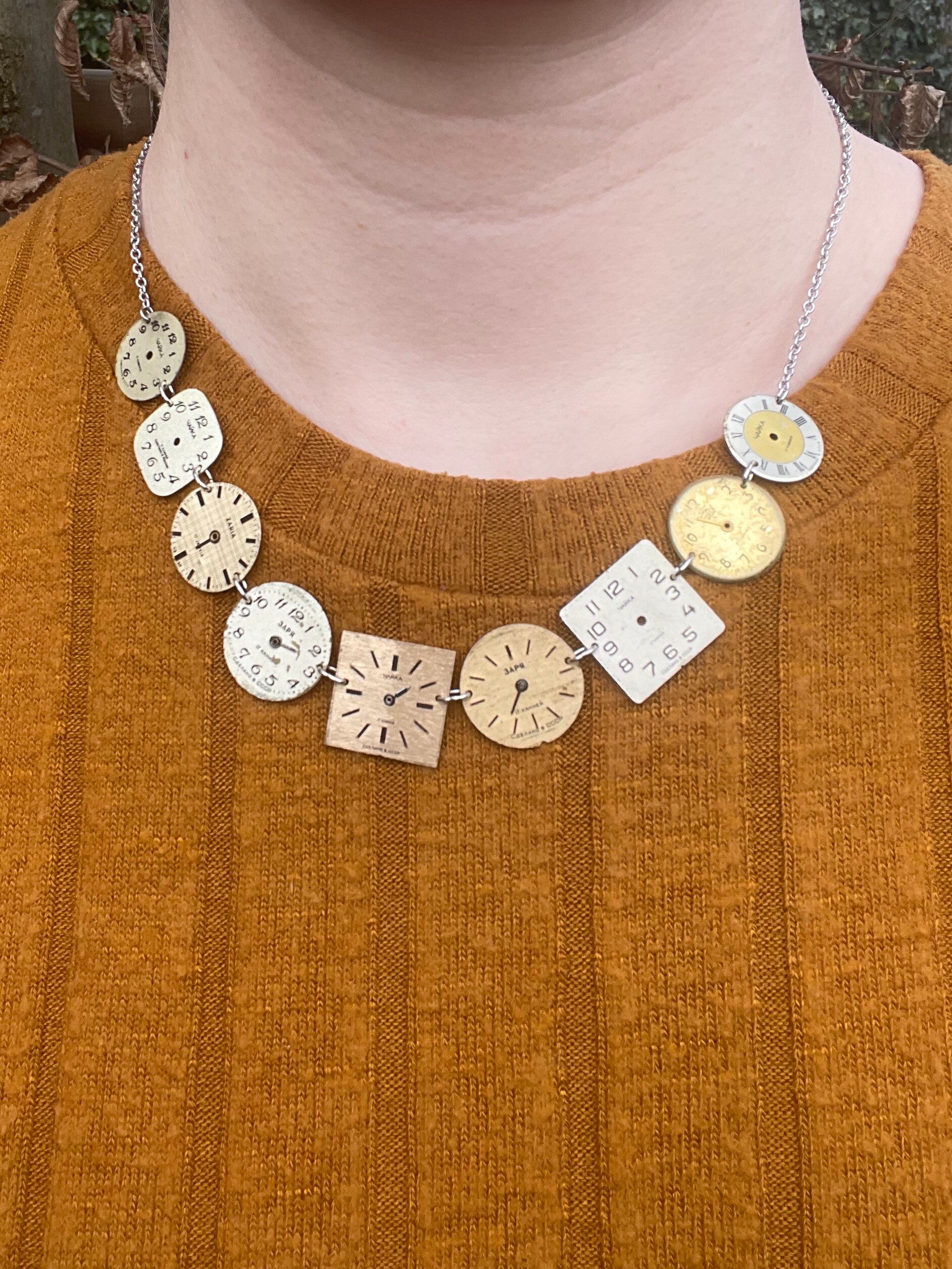 Ketting gemaakt met wijzerplaatjes uit oude dameshorloges
