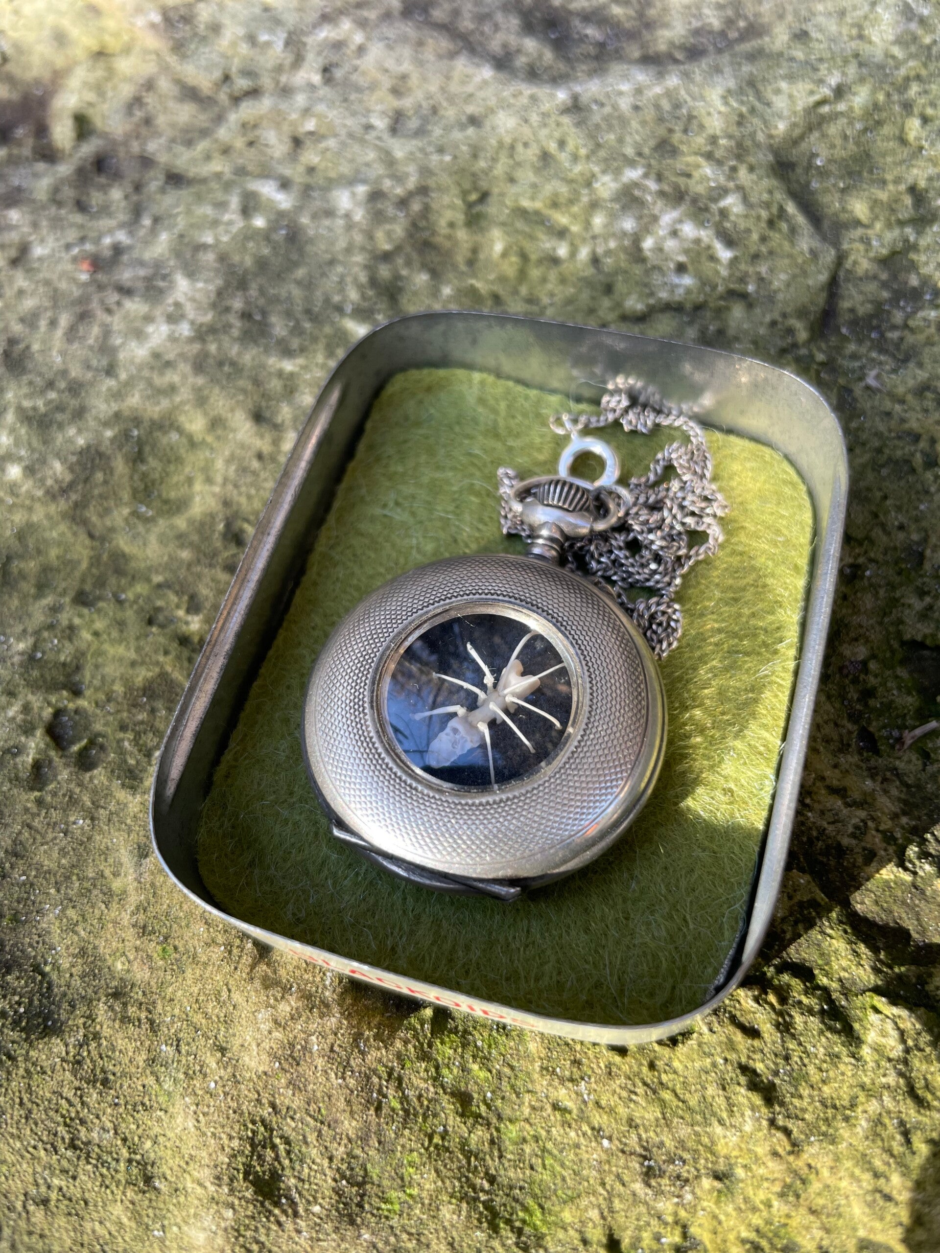 Deze ketting is gemaakt met een zilveren zakhorloge, ook de ketting is van zilver.