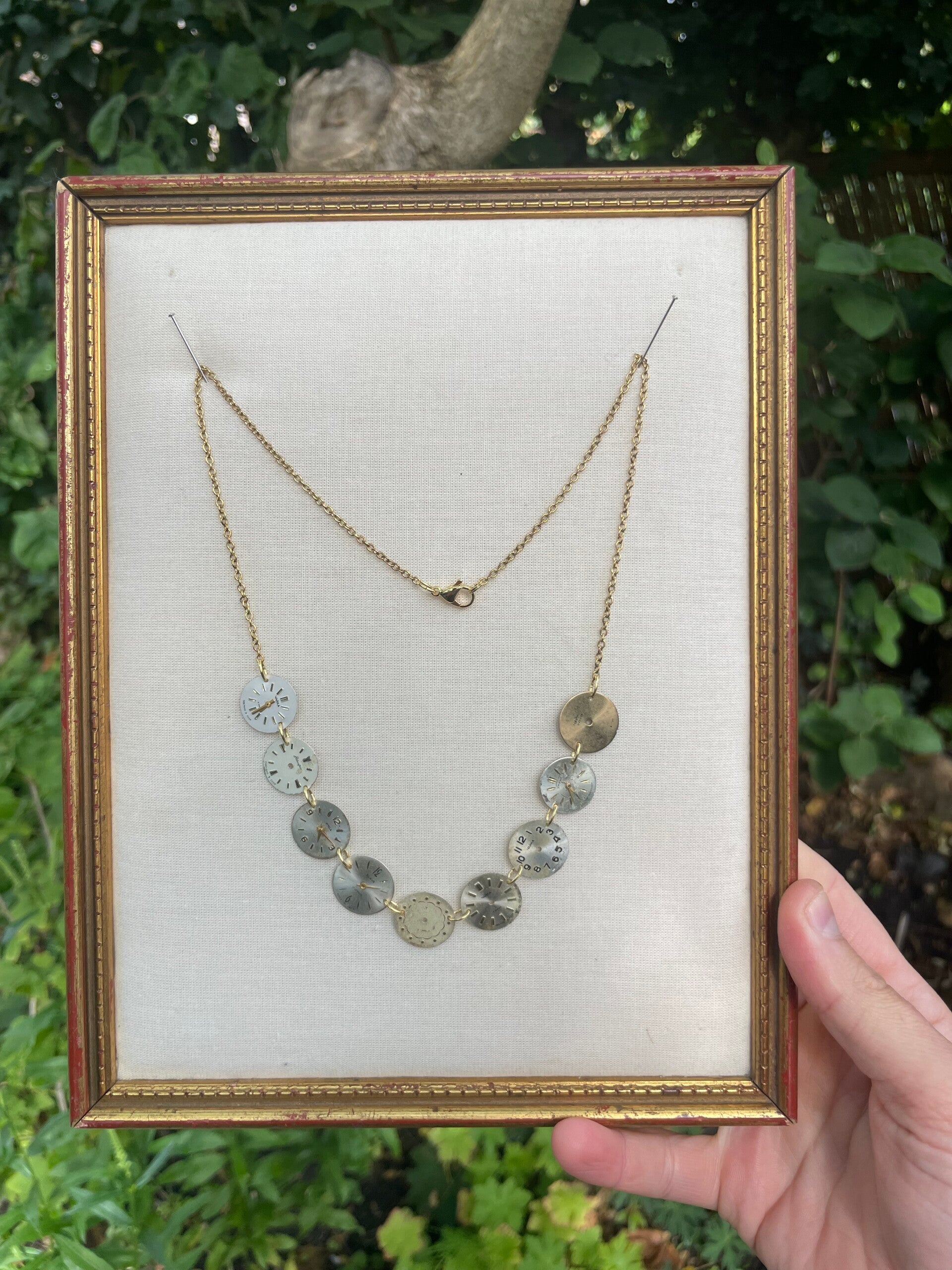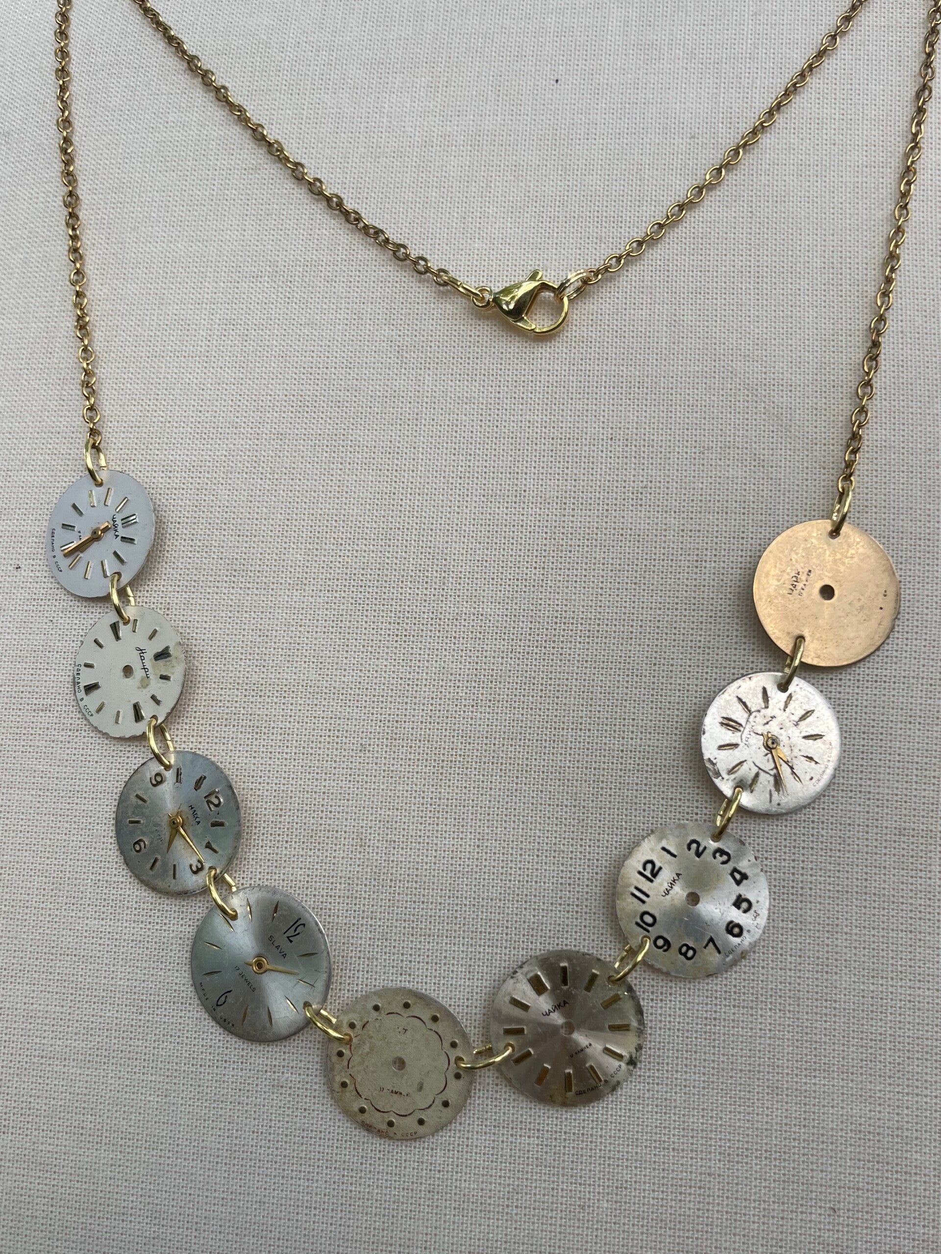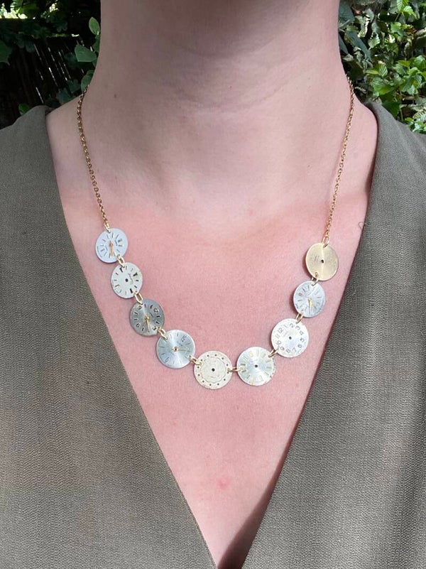 Ketting gemaakt met de wijzerplaatjes van oude dames horloges